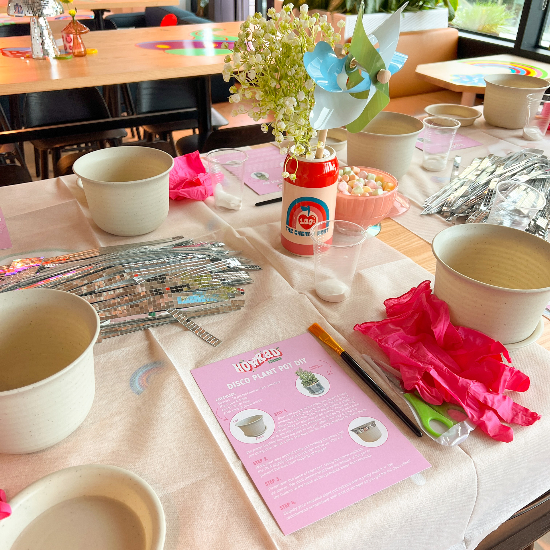 After extensive preparation and sourcing the perfect materials, we set the scene with a joyful, retro-inspired workshop space. Each attendee got to choose between creating a disco mushroom or a disco plant pot, using custom kits we designed and step-by-step instructions to guide them.